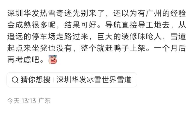 作为深圳重点项目,华发冰雪世界的进展一直吸引着市场的关注。华发股份此前曾对外宣称该项目预计于第四季度开业,市场猜测可能到11月份,而最终实际开业时间早于预期。但开业节奏的提前,也暴露除部分配套待改善的问题。