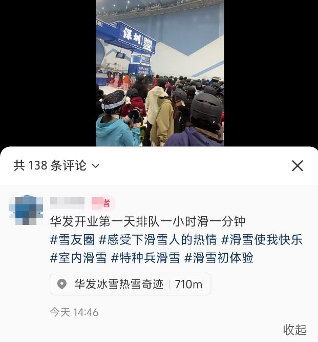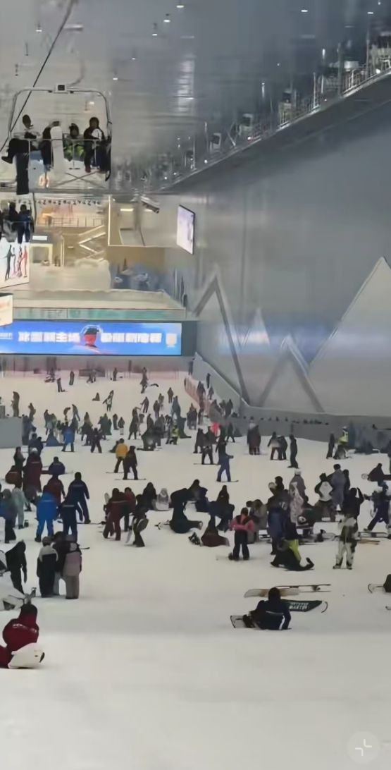 从开业首日流传的现场视频及图片来看,截至当日下午4点,雪场内的滑雪区域与公共区域仍保持较高人流密度,不少网友在社交平台调侃,现场人员密集的场景像“下饺子”。