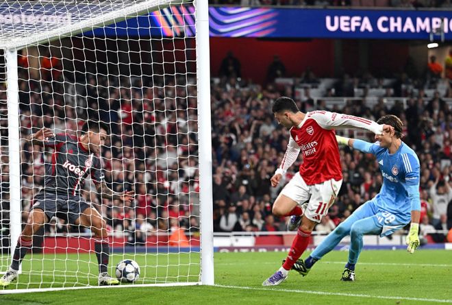 主场作战的阿森纳,在比赛开打后就大举压上围攻奥林匹亚科斯,第3分钟马丁内利门前接到队友传中,可惜头球攻门稍稍偏出,皮球擦着立柱出了底线,不过10分钟之后,马丁内利就弥补了遗憾,约克雷斯禁区内扛开防守球员后打门,击中立柱被弹出,马丁内利补射建功,职业生涯首次连续2场欧冠取得进球,帮助阿森纳取得了1-0的领先。