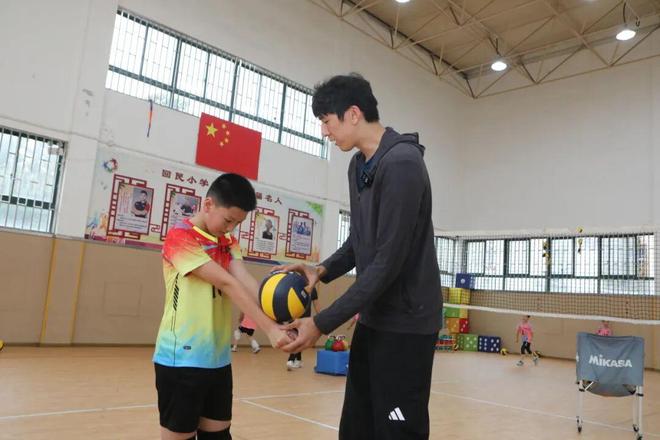 活动的高潮,是张哲嘉老师带来的 “冠军体育课”。他没有直接开始训练,而是先帮同学们梳理基础:“练排球先练‘脚’,脚步要先到位,走到接球的位置,再伸手去接,千万别急着抬手。” 随后,他亲自示范颠球、接球、发球的动作,手把手纠正同学们的姿势 —— 有的同学颠球总掉,张老师就蹲下来教他调整手型;有的同学发球没力气,他就指导如何借助身体的力量。最后,张老师还组织同学们模拟比赛阵型,练习 “一传、二传、扣球” 的配合,尽管同学们的动作还略显青涩,但每一个人都全情投入,操场上满是笑声与汗水交织的美好画面。