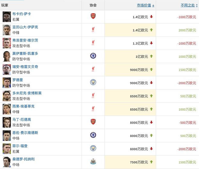 雷速体育10月17日讯 德转更新英超最新身价:维尔茨跌至1.3亿,凯塞多涨至1亿,托纳利涨至7500万。