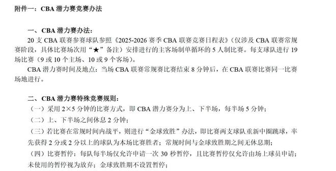 部分赛事规程节选CBA比赛结束八分钟后同一场地举办CBA潜力赛,参赛球员是非首发比赛的本土球员(外援禁止参赛),这也是主客场制单循环的5人制比赛。每支球队进行19场比赛(9或10个主场、10或9个客场)。CBA潜力赛采用2×5分钟的比赛方式,即CBA潜力赛分为上、下半场,每半场5分钟。若比赛在常规时间内战平,则进行“金球致胜”办法,即比赛两支球队重新中圈跳球,率先获得2分或2分以上的球队为本场比赛胜者;常规时间与金球致胜期之间无休息期。各球队参加 CBA 潜力赛的球员,应为CBA联赛当场比赛报名参赛的非首发国内球员。外籍球员不得参赛。额外参赛球员规则:各球队可最多增加2名 CBA 联赛非当场比赛报名的国内球员参加CBA潜力赛,但该规则只有在客队选择使用额外参赛球员时才适用于主队,主队不得单独使用额外