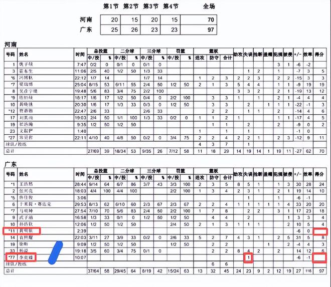 这场比赛广东队有四人得分上双,其中王浩然得24分,于米提得20分,来自深圳和广州的队员表现出色。而倒是来自广东宏远的队员表现拉胯,十分糟糕。也因为他们平庸,没有得到郑永刚的重用,徐昕、黄明依和李奕臻上场时间并不多,只打了几分钟,他们的数据更是辣眼睛。除了杨溢拿到6分8助攻外,有两名广东宏远队员合砍0分和1失误,真是让广东球迷哭笑不得。