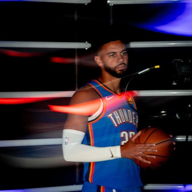 雷霆的最强大之处在于他们的防守,少了杰威,实际上他们的外线进攻火力损失了不少,这种背景下,米切尔成为了最大惊喜。他展现了非常全面的得分手段,既能突破终结,也能在中距离投篮,罚球更是稳得不行(本赛季至今94罚83中,命中率91.5%),在一些比赛里,对手已经开始对米切尔进行包夹,足以见得他的个人进攻有多出色。此外,米切尔也是一个水准之上的防守者,他身高1米93,臂展1米99,有着出色的防守意识和抢断能力,可以对位多个位置,提供不错的外线防守质量。